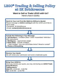 Send us a message with a list of your LEGO® you wish to trade, some pictures, and we will get back to you with a sell and/or trade quote. Once you receive the quote, you can bring your LEGO® to our store during the trading hours below.